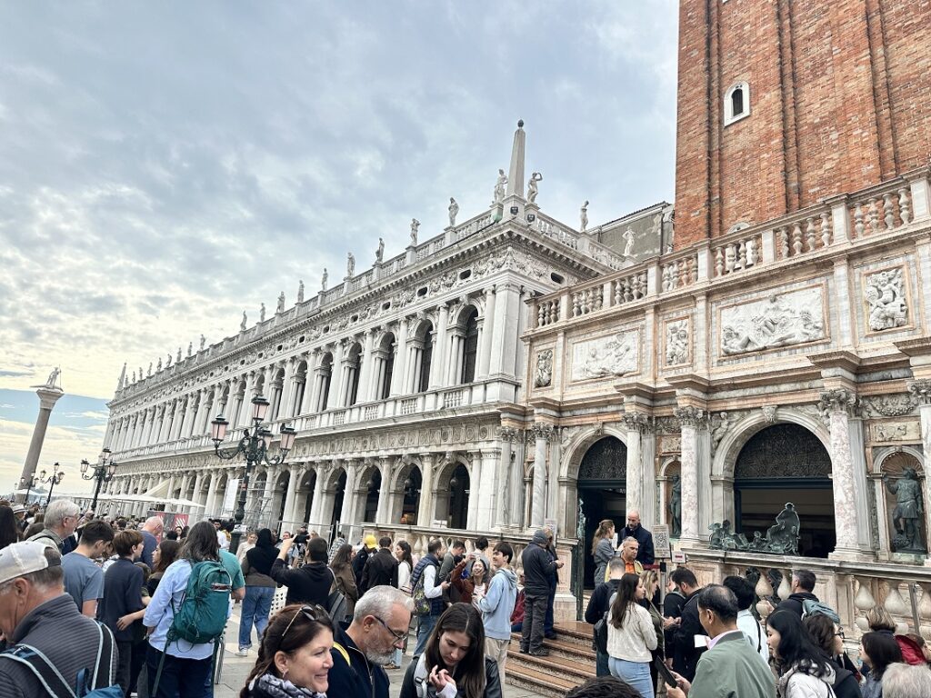 Jag beskådar den ikonförklarade Rialtobron, som har stått där sedan 1591 och i århundraden var den enda bron över Canal Grande. Det blir också tillfälle till en liten paus med ett glas vin och lite goda charkuterier på ett litet café innan jag går till Libreria Acqua Alta. Det här är en bokhandel där böckerna är staplade i gondoler, badkar och tunnor som skydd mot de vanligt förekommande översvämningarna i staden.