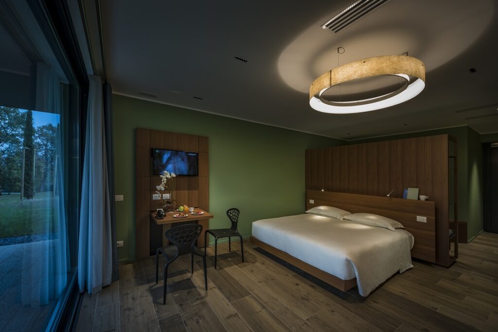 Halvannan timme nordost från Marco Polo-flygplatsen i Venedig hittar vi så resans första ”riktiga” stopp, Villaverde Resort och Udine Golf Club. Här finns ett hotell med modern design som är tänkt att smälta in lite mer i landskapet än vad resortkolosser brukar göra. Intressant nog finns här också en läkarmottagning med bland annat ögonkirurgi som specialitet på en av våningarna.
