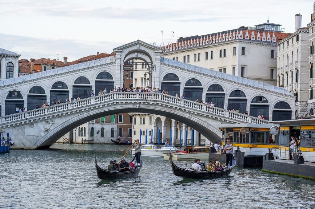 I en stad som är historisk på så många sätt är det passande att börja med att gå över Santiago Calatravas bro Ponte della Costituzione från 2008, ett av få moderna inslag i Venedig. Som förstagångsbesökare tittar jag storögt på alla kanaler och båtar, både modernare varianter för frakt av varor och de klassiska gondolerna med små pallar där man kan turista ståndsmässigt.